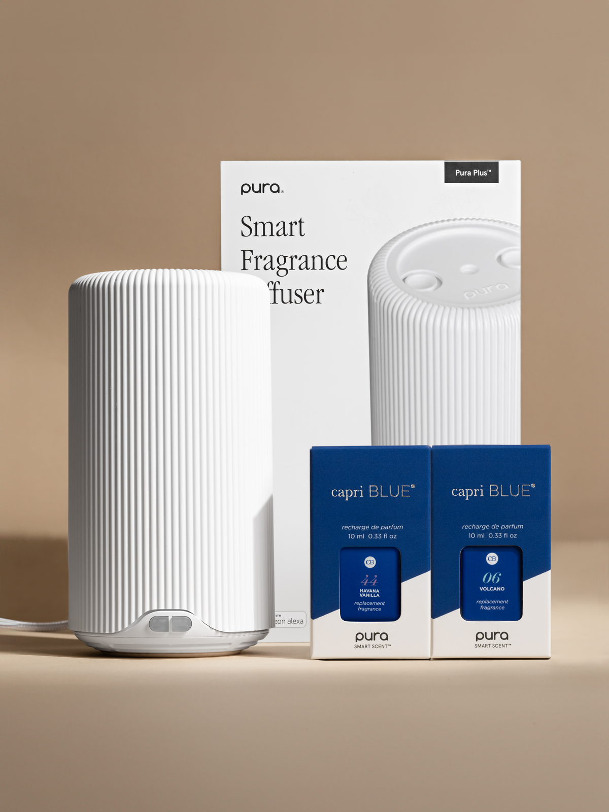 This set includes two premium Capri Blue scents, Volcano and Havana Vanilla, and a Pura Plus™ smart fragrance diffuser.
