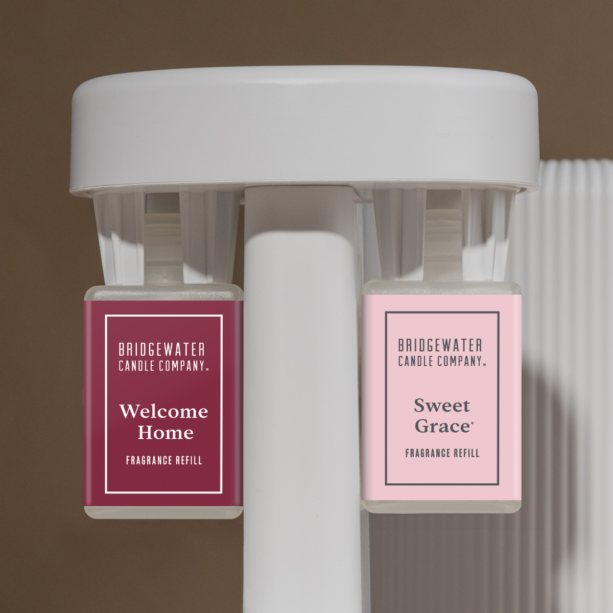 This set includes two premium Bridgewater Candle Company scents, Welcome Home and Sweet Grace, and a Pura Plus™ smart fragrance diffuser.