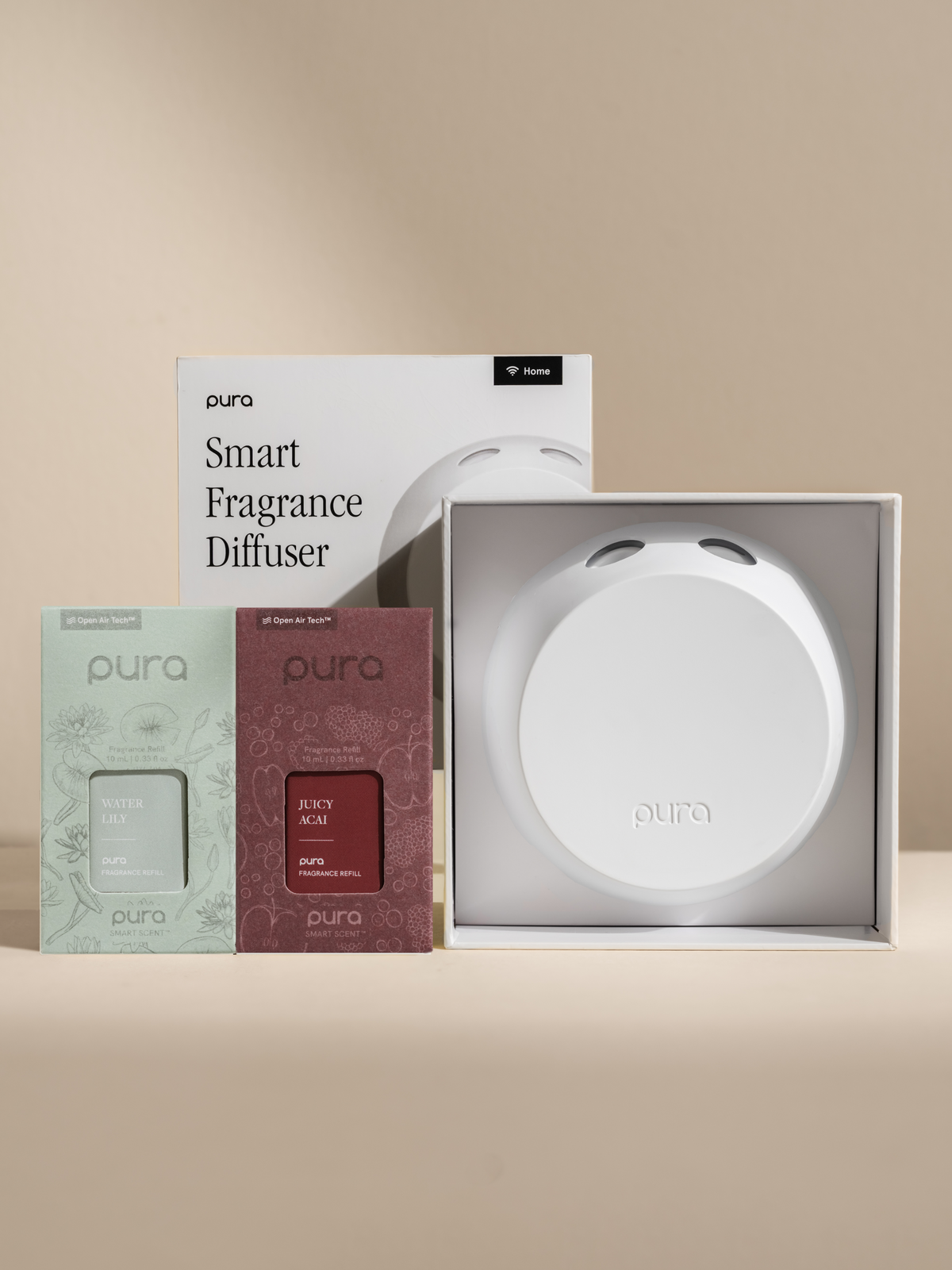 This set includes two premium Open Air Tech scents, Juicy Acai and Water Lily, and a Pura 4™ smart fragrance diffuser.
