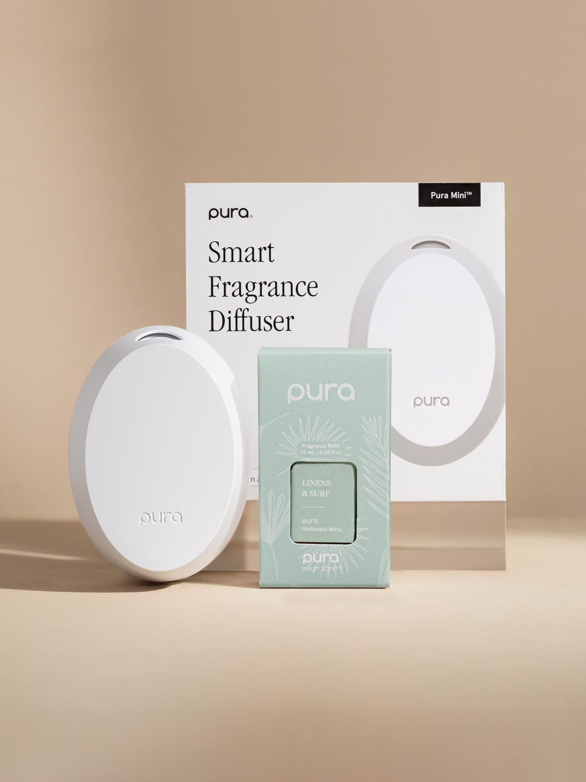 This set includes one Pura Linens & Surf fragrance vial and a Pura Mini™ smart home diffuser.